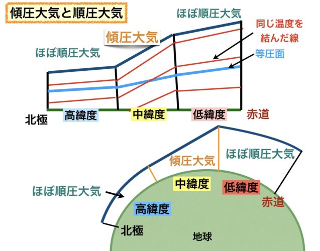 最初の図の上側のイメージです。南北の温度差が大きく、同じ温度を鉛直方向に結んで線を作ると等圧面を横から見た線と交差しているのが分かります。