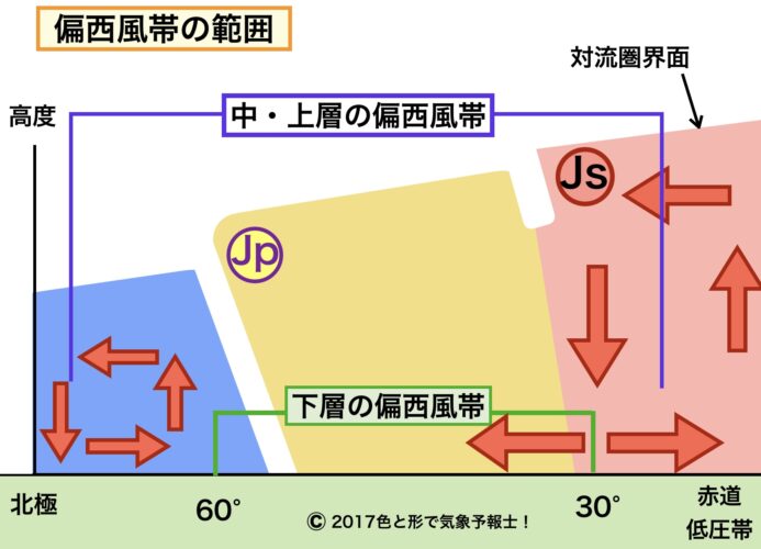 加えて、下層部も赤道付近と極地方を除いて偏西風帯とみなしています。