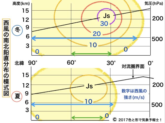 対流圏界面付近に風速の中心があり、ここが亜熱帯ジェット気流(Js)となっています。夏の方が亜熱帯ジェット気流の位置が高緯度側にずれていますが、この点については別記事で取り上げます。