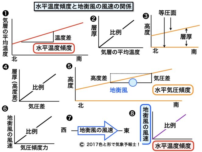 最初と最後を結びつけると、地衡風の風速は水平温度傾度によって決まる