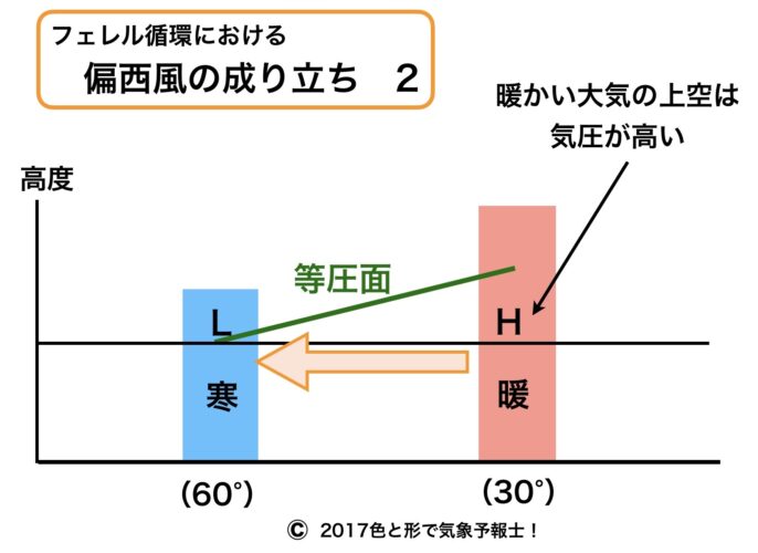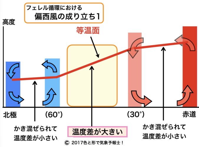 フェレル循環内では、まず南北の温度差が南北の気圧差を生じさせて高緯度側に風が吹き、それがコリオリ力によって東向きの地衡風となって偏西風が生じます。