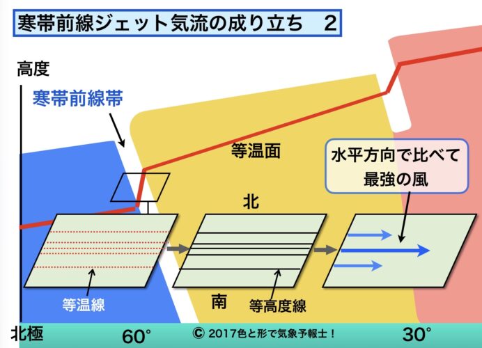 模式図「寒帯前線ジェット気流の成り立ち 1」をご覧ください。赤い線は等温面のイメージです。