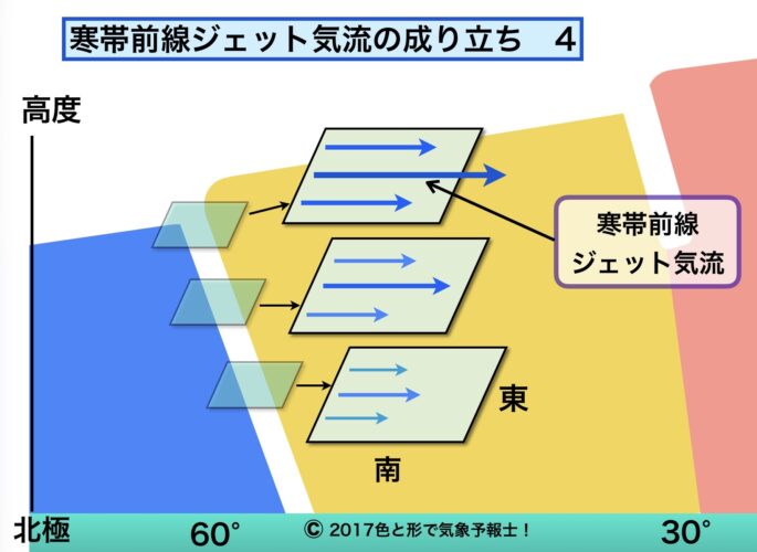 図「寒帯前線ジェット気流の成り立ち 4」から説明します。