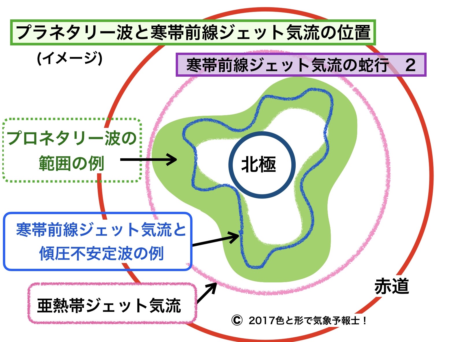 模式図「プラネタリー波の成因」をご覧ください。大きな緑の帯がプラネタリー波です。