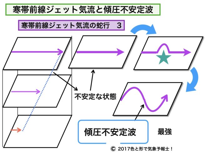 以上が寒帯前線ジェット気流が蛇行する、ごく基本的な理由になります。